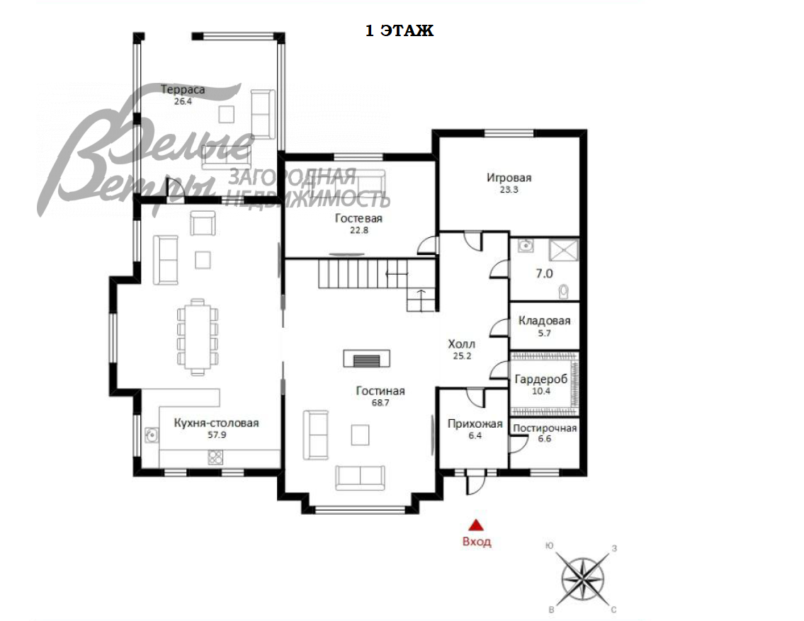 1-ый этаж: прихожая, гардеробная, постирочная, кладовая, игровая комната, спальня первого этажа, гостевой санузел, кухня, столовая зона с выходом на крытую террасу, гостиная с камином