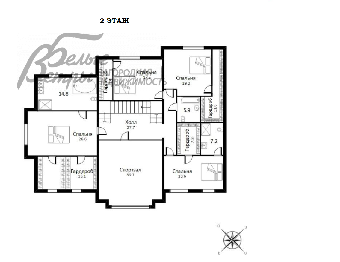 2-ой этаж: хозяйский блок с большой гардеробной и санузлом, спальный блок с двумя спальнями, с двумя гардеробными и санузлом, спальня с санузлом, спортзал/игровая, зона библиотеки
